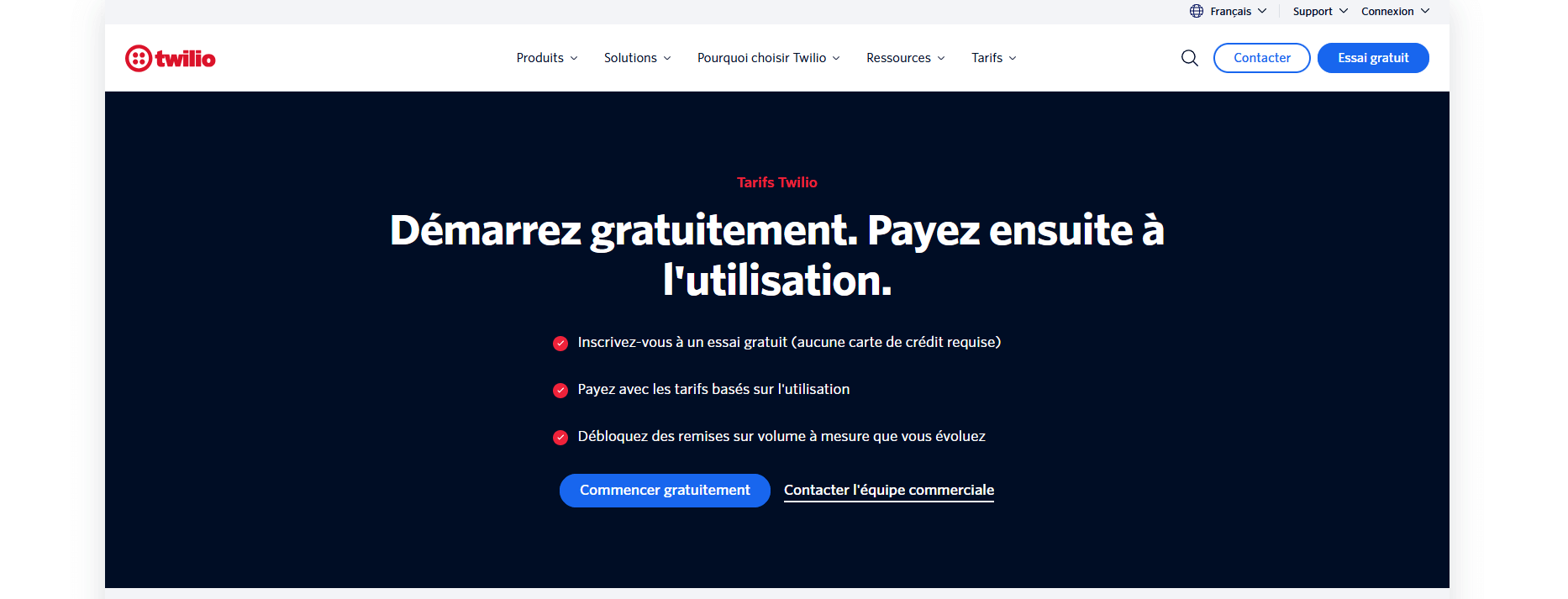 | Twilio | API puissante pour projets sur mesure | à Partir de 0,0083 $ | Via API |