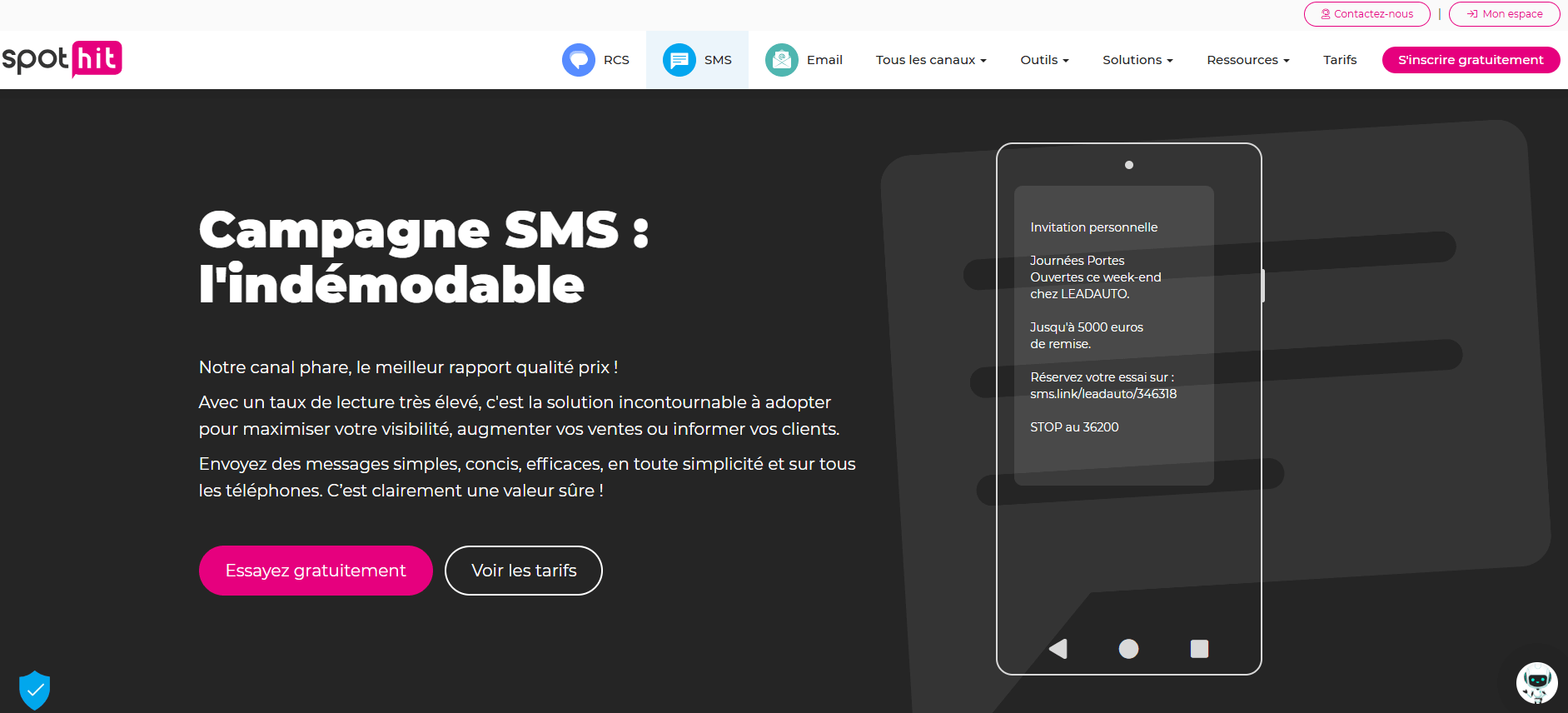 | Spot-hit | Marketing mobile multicanal | À partir de 0,039 € / SMS | Oui |